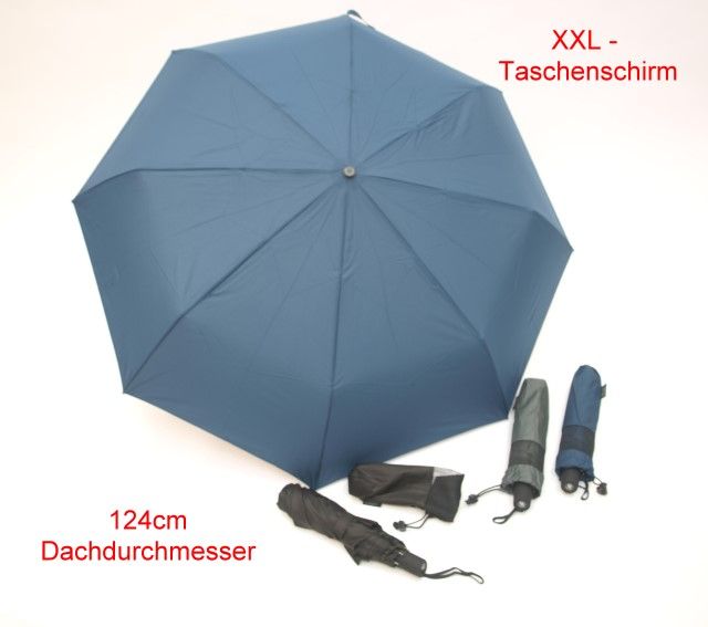 Riesig groß: Mit einem Dachdurchmesser von 124cm erreicht dieser Taschenschirm die Größe eines Partnerschirmes / Gästeschirmes / Golfschirmes und bietet Platz für 2 Personen. Zusammengelegt hat er nur eine Länge von ca. 34cm und ist damit unwesentlich länger als Standard-Taschenschirme.